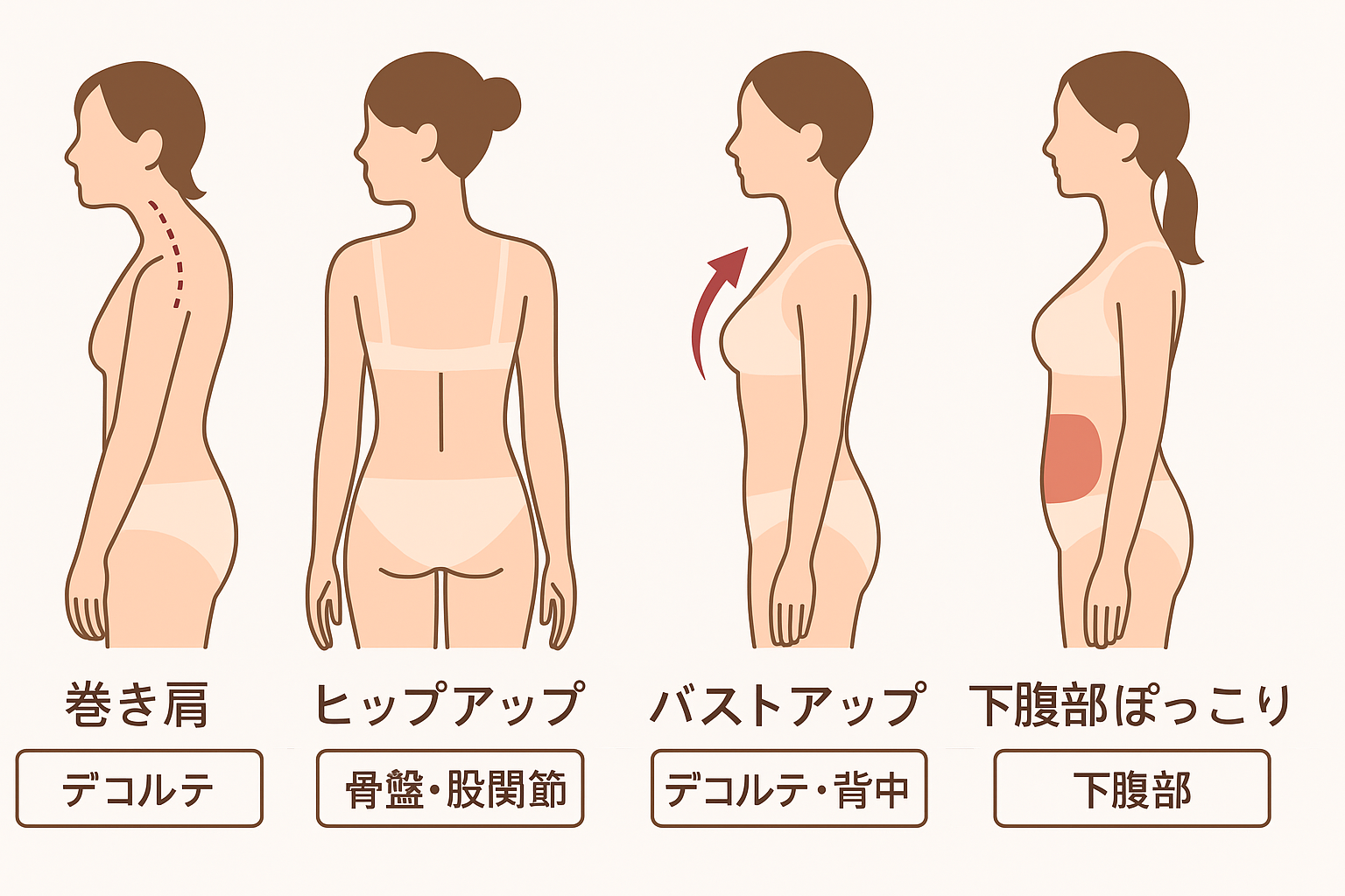 例)猫背・巻き肩・骨盤のゆがみ・ヒップライン・ウエストライン・脚のラインなど お悩みに合わせて1か所を丁寧に調整します。