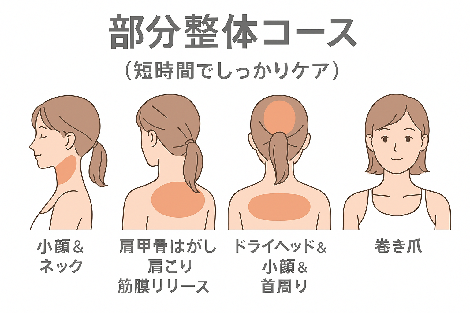 60分の内容に加え、肩回りの通常整体の要素(巻き肩・肩甲骨の可動域改善など)も組み合わせ可能。