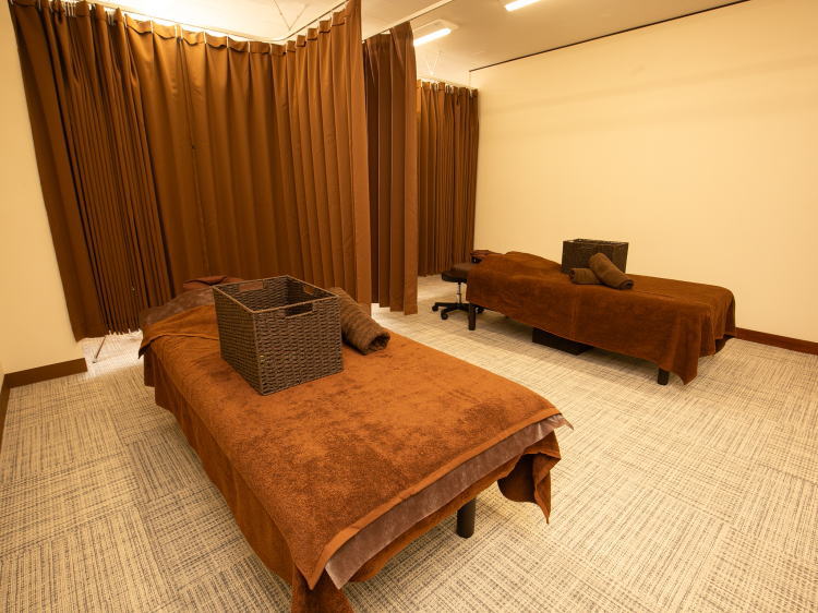 仕切りカーテンでプライバシーを守りながらも、明るく広々とした空間。 複数のベッドがあり、友人やご家族との同時利用にも対応しています。 お客様が安心して施術に集中できる、快適な空間作りを心がけています。