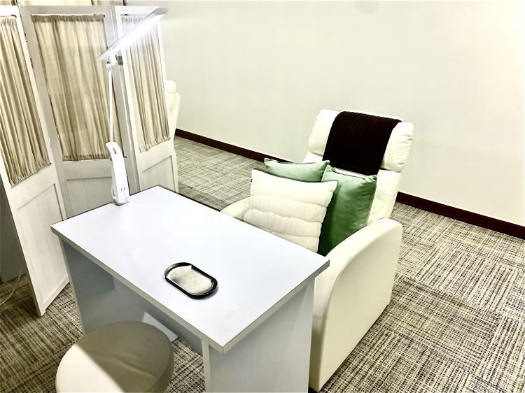 ゆったりリクライニングチェアと施術用デスクが2台あり、 広々とした施術空間でお客様もリラックスできます。