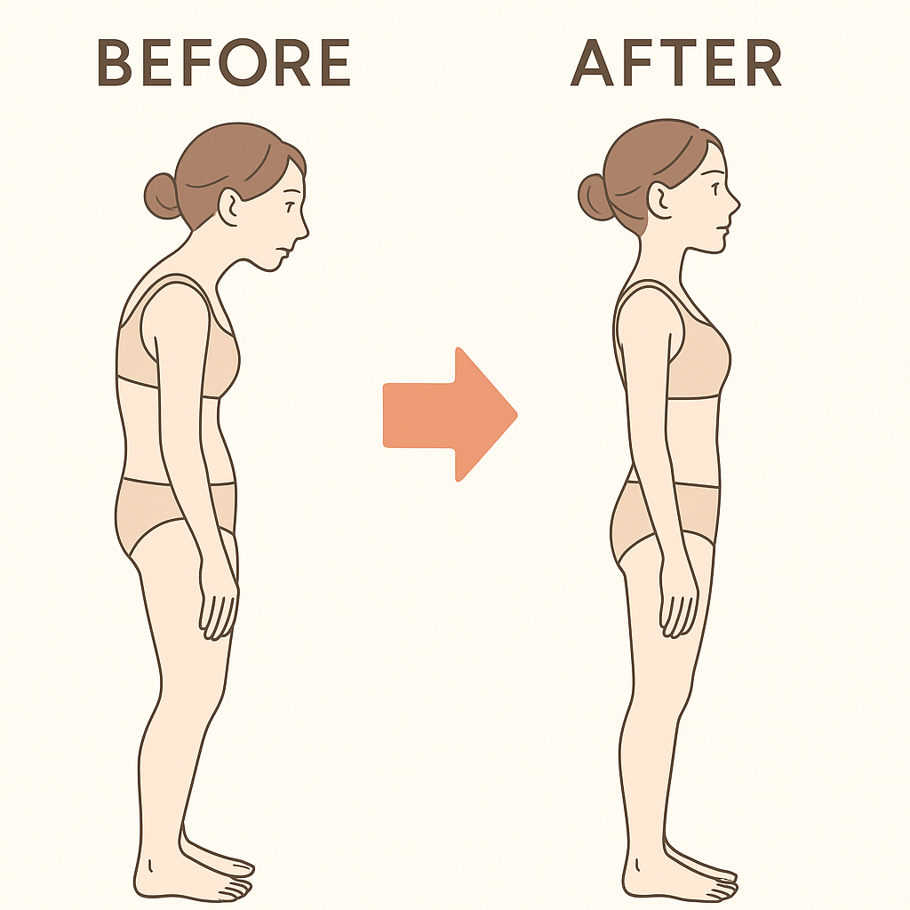 姿勢の変化は、継続的な施術と日常習慣の見直しで少しずつ起こっていきます。 この図はその一例としてご紹介しています。