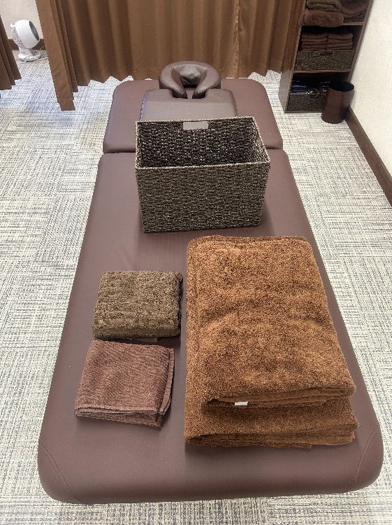 施術ベッドには清潔なタオル(有料)とお着替え用のカゴをご用意。