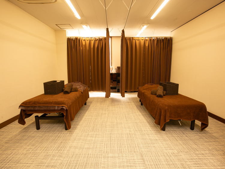 仕切りカーテンでプライバシーを守りながらも、明るく広々とした空間。 複数のベッドがあり、友人やご家族との同時利用にも対応しています。 お客様が安心して施術に集中できる、快適な空間作りを心がけています。